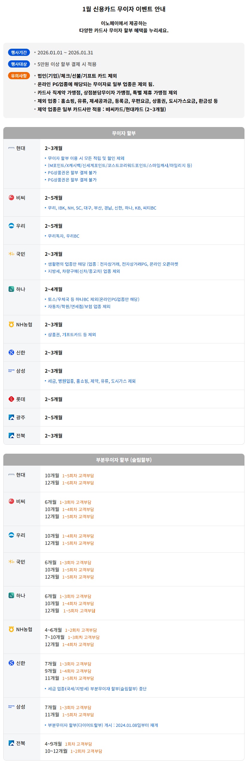 2026년 1월 신용카드 무이자(부분무이자) 안내