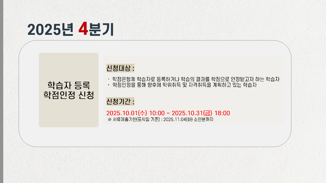 2025년 4분기 학습자등록・학점인정신청작성자 : 관리자|등록일 : 2025.09.25|조회수 : 143